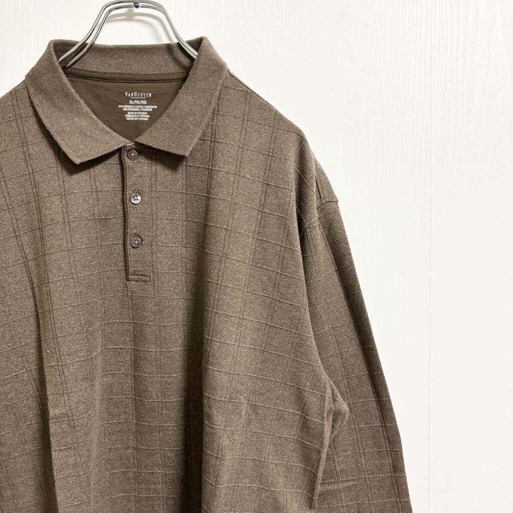 古着 used VANHEUSEN 長袖総柄ポロシャツ チェック柄 カーキ レトロデザイン ノームコア シンプルXLサイズ