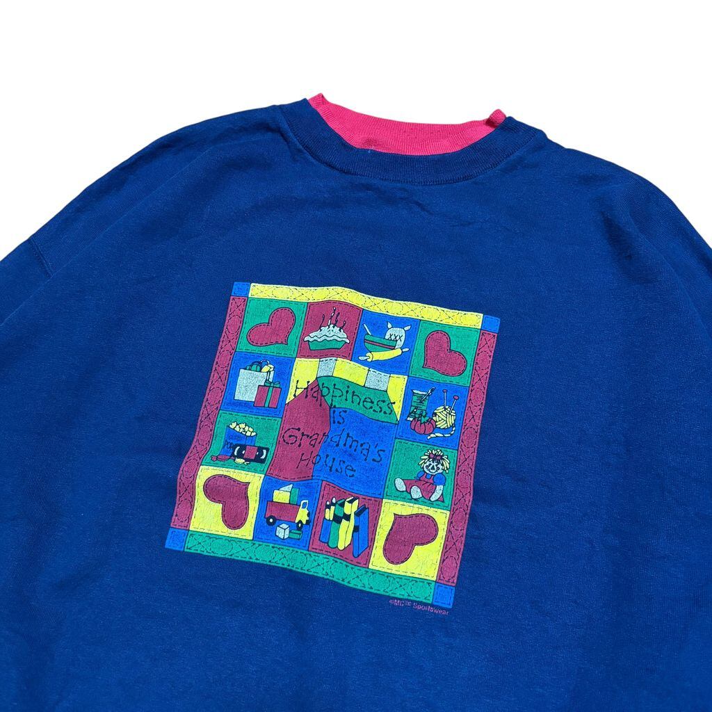 古着 used 長袖ダサかわプリントスウェット トレーナー ネイビー 紺 レトロデザイン Lサイズ