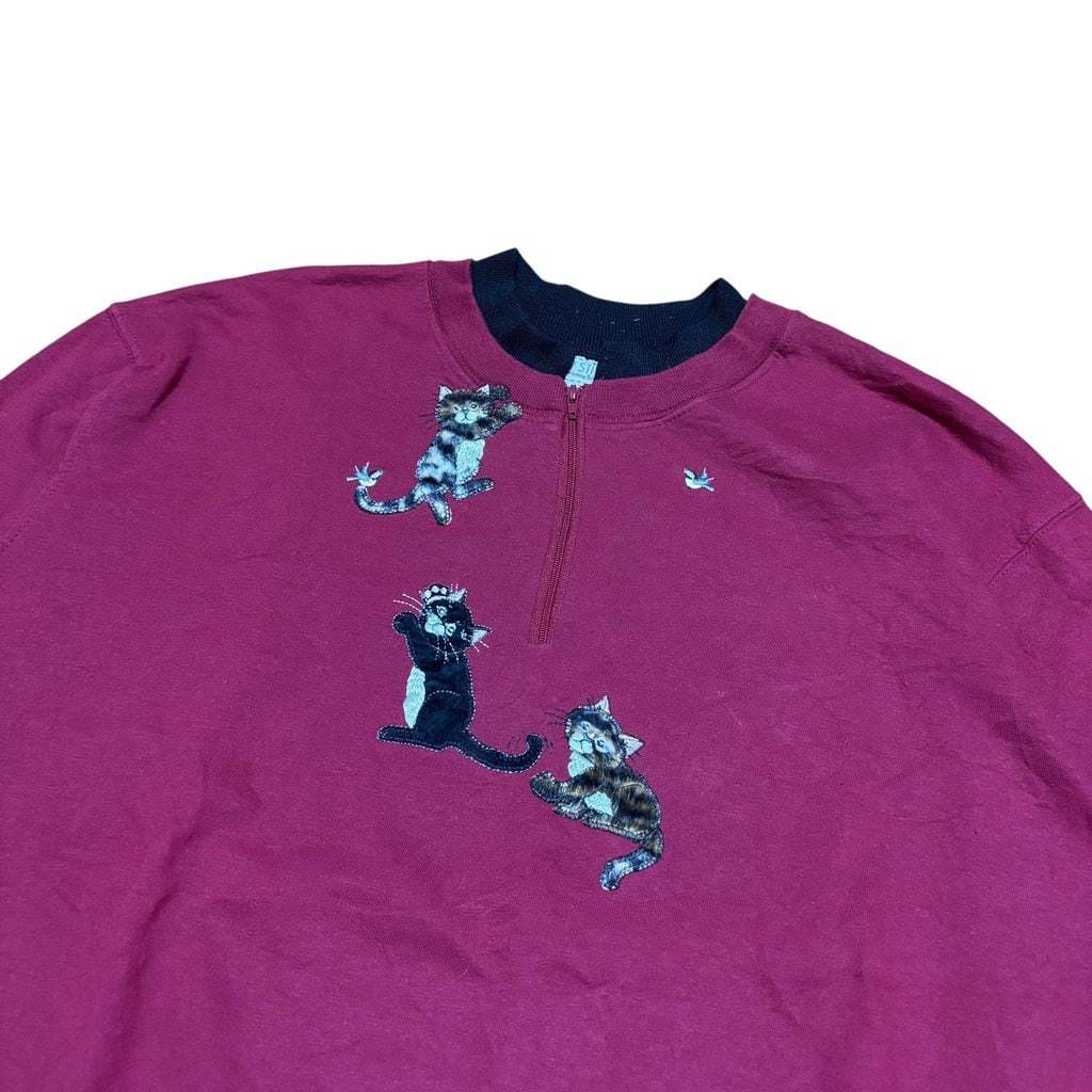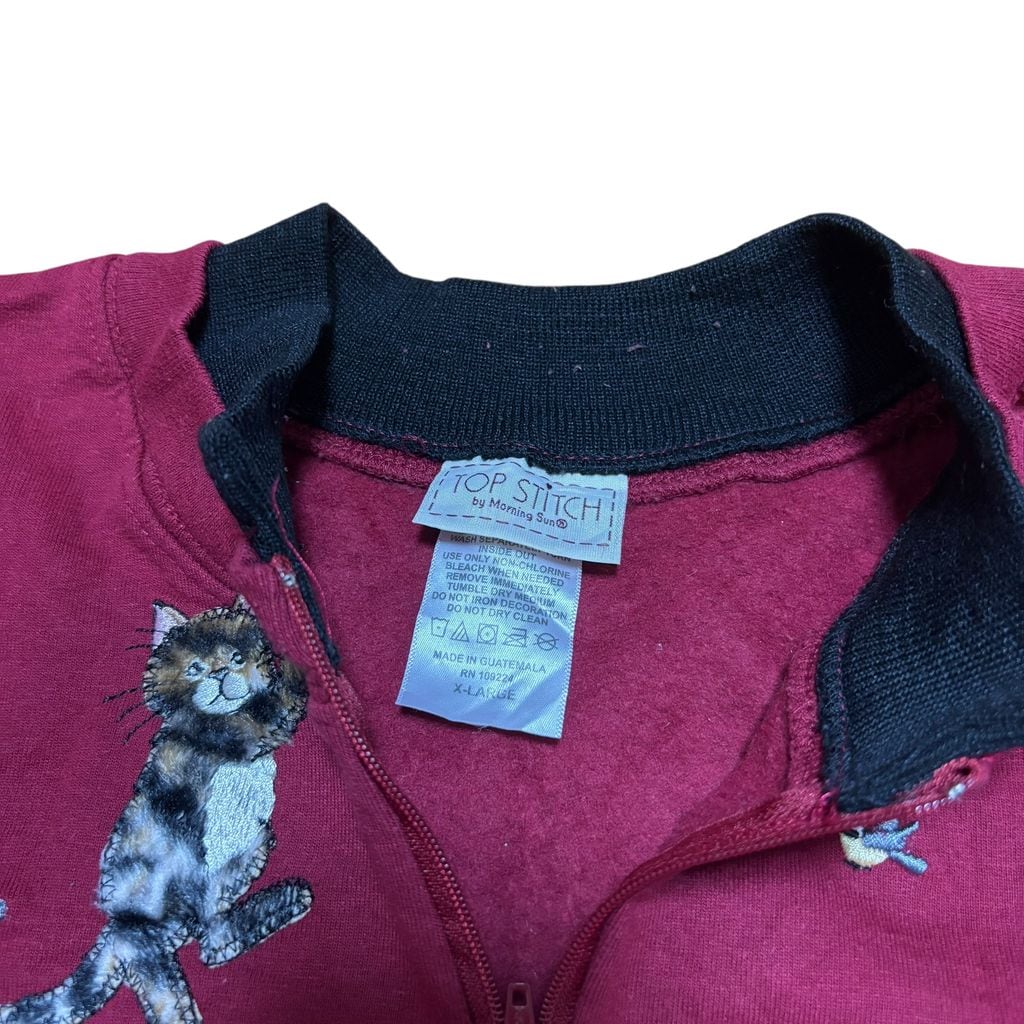 古着 used Top Stitch 長袖ハーフジップスウェット トレーナー アニマル柄 猫柄 ワインレッド えんじ色 XLサイズ