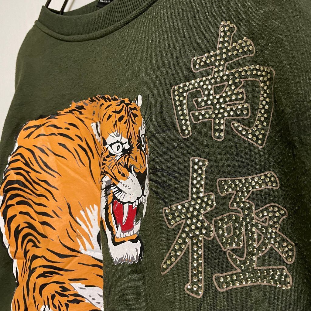 古着 used SOUTHPOLE 長袖虎柄プリントスウェット トレーナー ラインストーン カーキ アニマル柄 派手 XLサイズ