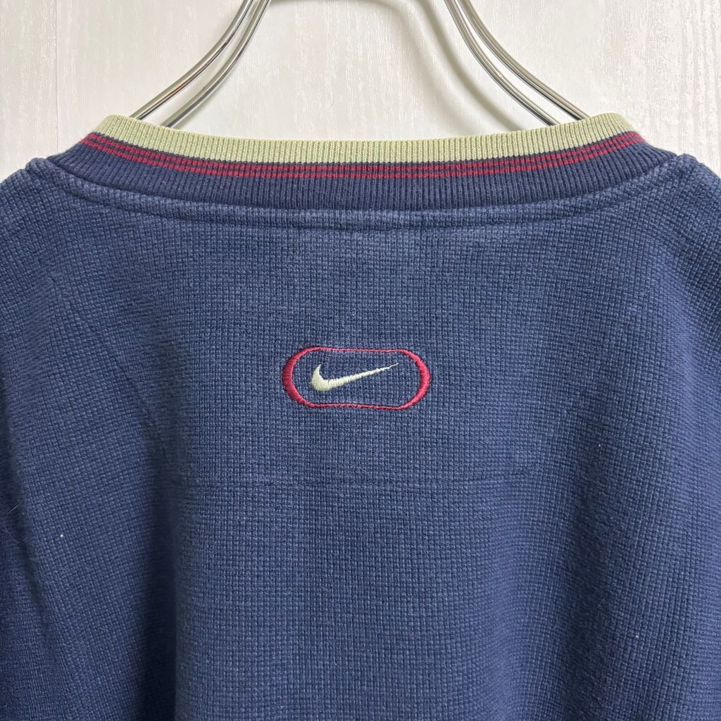 古着 used 90s 白タグ NIKE ナイキ 長袖ワンポイントロゴ刺繍ニット セーター レトロデザイン ネイビー XXLサイズ