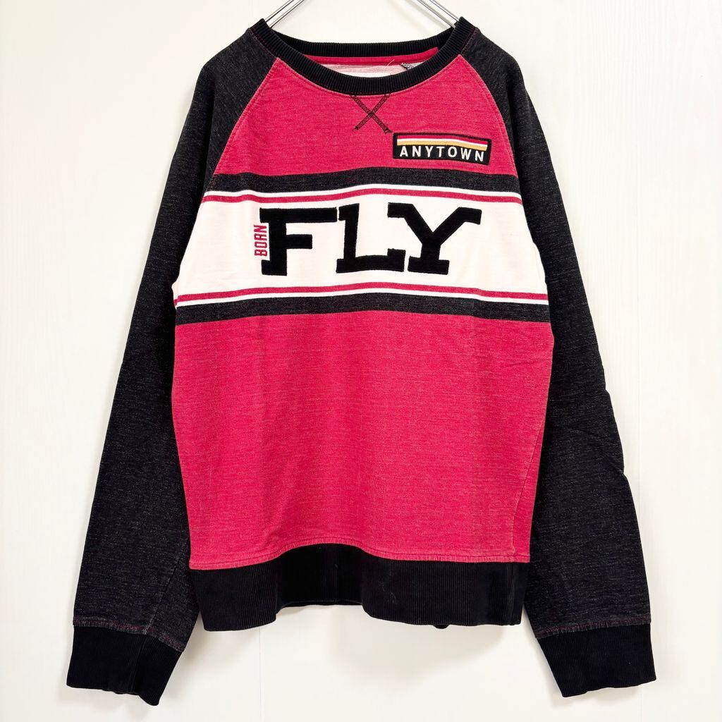 古着 used Born FLY 長袖刺繍スウェット トレーナー レトロデザイン ラグランスリーブ 赤 派手色 Lサイズ